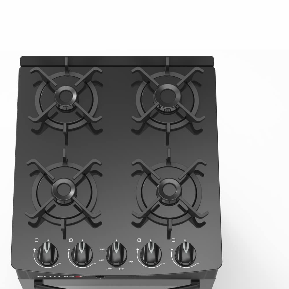 • 4 quemadores a gas o supergas, con tapas enlozadas y esparcidor en acero inoxidable.